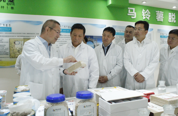 段志強一行首先參觀了民豐種業脫毒組培中心展廳,詳細了解了馬鈴薯脫毒種薯生產過程及企業發展情況。張國介紹,內蒙古民豐種業有限公司成立于2008年,注冊資本1.3億元,已累計完成投資10億元以上,公司已發展成為集馬鈴薯種薯、訂單薯生產及馬鈴薯、燕麥深加工于一體的全產業鏈集團化企業,是“農業產業化國家重點龍頭企業”、“國家高新技術企業”、“自治區扶貧龍頭企業”。目前,公司已發展成為一家融合農業和食品加工業的全產業鏈集團化公司,形成以食品加工帶動農業,以農業服務食品加工,一、二、三產融合、農商互聯齊頭并進的良性發展業務格局。