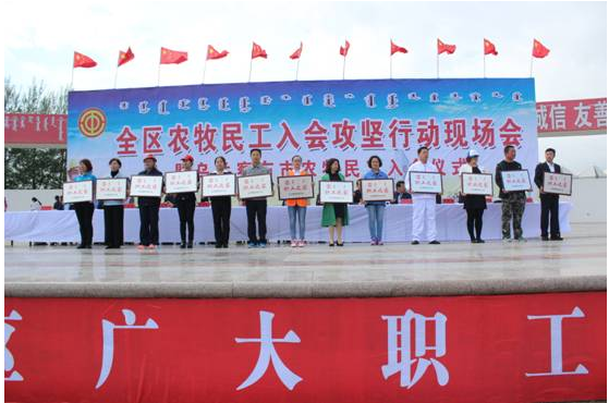 6月14日,全區農牧民工入會攻堅行動現場會暨烏蘭察布市農牧民工入會儀式在我市舉行。我公司組織30人的方隊參加了入會儀式。期間,自治區人大常委會副主任、總工會主席杭桂林,自治區總工會黨組書記、副主席崔明龍,自治區總工會副主席王麗紅,我市領導張琛、李建平、楊國文、王增強、王國相、于生龍,和各盟市工會分管主席、主管部門部長,各盟市黨委政府所在地的區(市、旗)總工會主席,各自治區產業工會負責人,自治區直屬機關工會工委負責人,區總相關部門負責人,市各旗縣市區工會負責人及部分市直基層工會負責人100余人來我公司進行了實地觀摩考察。
